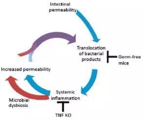 在正常的人体和小鼠体内,衰老的过程会伴随与血液和组织中促炎症因子(如肿瘤坏死因子TNF和白细胞介素6)水平升高。其中,TNF的增多会损害巨噬细胞的功能,并增加肠壁的通透性。相比之下,无菌小鼠则不会随着年龄增长而出现TNF水平的增高。与此相符,TNF表达缺陷小鼠则不会发展出衰老相关炎症。正常小鼠若被施以抗TNF单抗药物Humira,则会减少肠道微生物群因衰老发生的变化。这说明,肠道菌群组成可因宿主体内的炎症状态而改变。