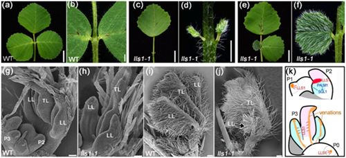 科研人员在以前的研究中发现了蒺藜苜蓿的LEAFY同源基因SINGLE LEAFLET1(SGL1)参与蒺藜苜蓿三出羽状复叶的侧小叶的起始过程,另一个C2H2转录因子PALMATE-LIKE PENTAFOLIATA1(PALM1)通过抑制SGL1的表达,也参与侧小叶的起始和初级形态建成活动。但目前对于蒺藜苜蓿复叶的次级形态建成相关机制的认识还不深入。