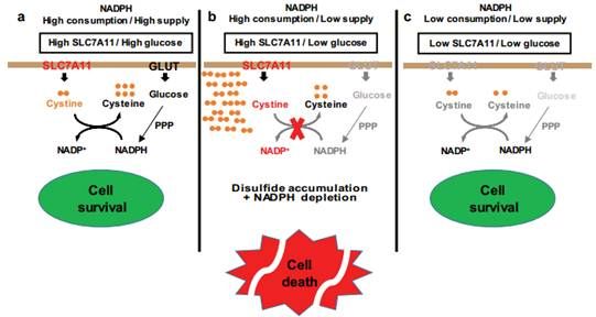 而细胞内NADPH主要来源于葡萄糖代谢旁路——戊糖磷酸途径,所以导致其高度依赖于葡萄糖的供给。在葡萄糖缺乏时,癌细胞的高SLC7A11表达会导致细胞内胱氨酸和其他二硫化物的明显积累,氧化还原系统崩溃,进而导致细胞快速死亡。