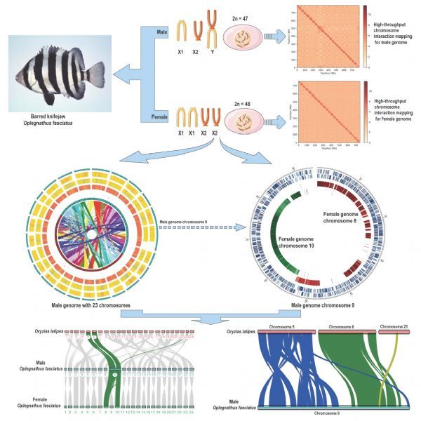 近日,Cell子刊iScience在线刊发中国科学院海洋研究所李军研究组与刘静研究组合作完成的题为Chromosome-level Genome Reveals the Origin of Neo-Y Chromosome in the Male Barred knifejaw Oplegnathus fasciatus 的研究论文。该研究首次从全基因组层面证实条石鲷雄鱼存在染色体融合现象,解决了雄鱼异型染色体Y融合起源问题,为鱼类异型染色融合演化及性别决定机制解析奠定了重要基础。