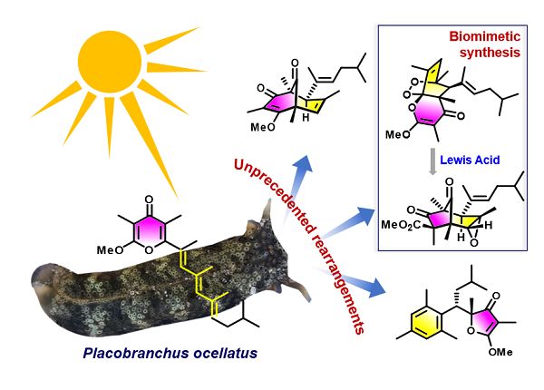 为了探究这些分子与该软体动物应对强光照射的化学生态学关系,作者对这几个新骨架化合物进行了光催化生物合成途径的推导,并由此成功实现了新骨架化合物ocellatusone A(1)的仿生合成,证实了所推测的仿生合成途径的合理性。在反应过程中,作者利用了从该软体动物中分离得到的叶绿素充当光敏引发剂进行模拟生物体内的光催化过氧化反应,并通过路易斯酸进一步催化进行了国际首次报道的全新串联环化作用。这一仿生合成揭示了该软体动物通过产生不饱和聚丙酸酯类化学防御物质,并利用摄取的叶绿素进行一系列光化反应来抵御强光辐射的生态现象。