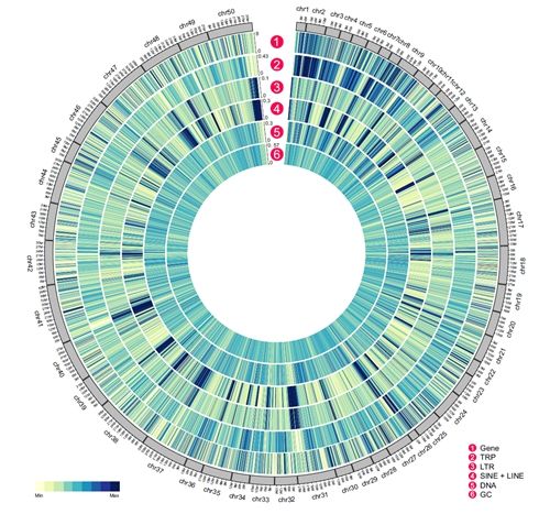 中华绒螯蟹(Eriocheir japonica sinensis)俗称河蟹,是世界上最重要的淡水经济蟹类,目前我国每年河蟹产量为80万吨左右。研究人员获得的中华绒螯蟹基因组大小为1.27Gb,Contig序列N50为3.19Mb,且其GC含量为43%,高于其他节肢动物。BUSCO评估其完整性为94.00%,重复序列在基因组中占61.42%,被功能注释蛋白编码基因22619个。