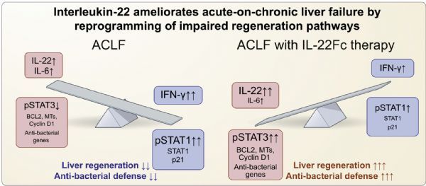同时,研究团队发现,肝内STAT1/STAT3激活失衡影响肝再生是慢加急性肝衰竭病程进展的重要机制,并以此小鼠模型首次证实通过干预肝内STAT1/STAT3激活失衡,可以改善慢加急性肝衰竭小鼠的预后,发现通过新型细胞因子白介素22(IL-22)可以调控肝内STAT1/STAT3激活失衡,从而阻断病程进展。该研究成果为患者的临床治疗提供了免疫治疗新策略,推动该方案的临床研究将会为我国广大的慢性肝病人群带来更多的康复希望。
