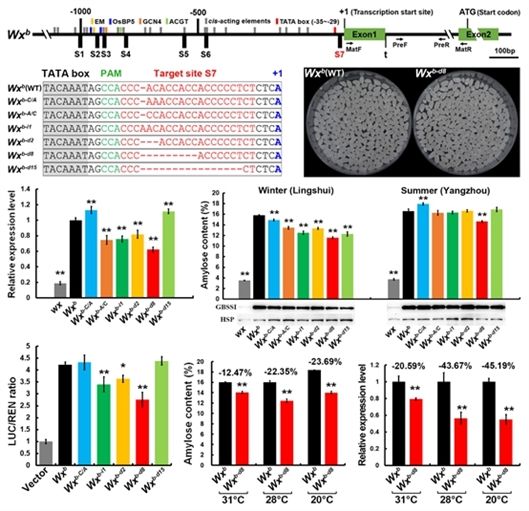 刘巧泉团队通过CRISPR/Cas9技术编辑水稻Wx基因启动子上的关键顺式作用元件,并进一步通过表达分析和启动子活性的体外验证证明,编辑该位点确实可以适度调节Wx基因的表达。在不同气候条件下,新的Wx等位变异材料表现出不同的变化趋势。