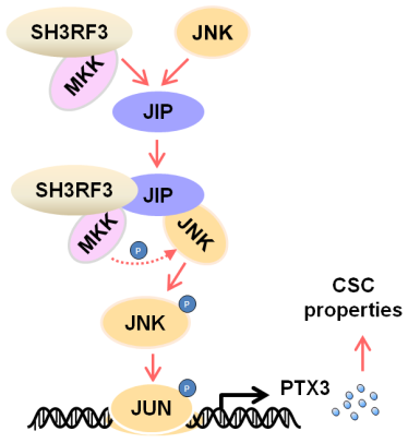 此项研究发现,在乳腺癌细胞模型中,过表达SH3RF3提升了乳腺癌细胞的肿瘤细胞球形成能力及其致瘤性。在乳腺癌病人来源的类器官体中同样证实了SH3RF3对肿瘤干性特征的促进作用。这表明SH3RF3的表达能够提升乳腺癌细胞的干性特征,增强乳腺癌细胞的恶性程度。机制研究表明,SH3RF3能够与MKK-JNK复合体相互作用,以JIP依赖的方式促进JNK-JUN信号通路的激活,进而促进PTX3的表达,最终提升肿瘤细胞干性特征,增强肿瘤细胞的恶性程度。病人来源的肿瘤样本分析也证实SH3RF3与肿瘤细胞的干性特征存在明显的相关性,并与病人的不良预后相关。