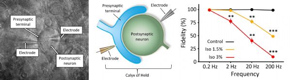 CMSF研究小组用老鼠的大脑切片来研究一个巨大的突触,这个突触被称为calyx of Held。科学家们诱导不同频率的电信号,然后检测突触后神经元产生的动作电位。他们发现,当他们增加电信号的频率时,异氟烷对阻断传输有更强的作用。