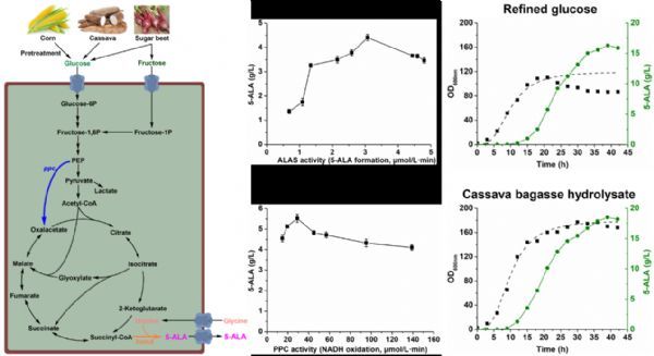 近日,中国科学院天津工业生物技术研究所研究员郑平带领的系统与合成生物技术研究团队和研究员孙际宾带领的系统生物学中心研究团队合作,在利用可再生生物质原料高效合成5-ALA方面取得新突破。研究基于常用的工业发酵底盘菌株谷氨酸棒杆菌,首先通过不同来源5-ALA合成酶的筛选测试,确定了性能具有明显优势的关键酶;随后利用基于RBS优化的策略精细调控关键酶的表达,对5-ALA合成途径和前体供应途径进行优化平衡,大幅提高了产物产量和底物转化率,通过补料分批发酵,改造后的菌株在5 L发酵罐中5-ALA产量达到了16.3 g/L。