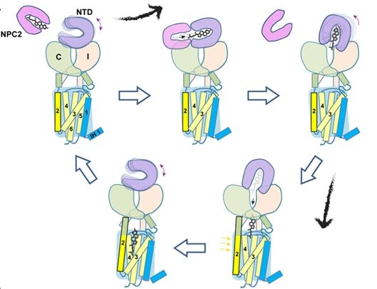 这项研究展示了胆固醇分子在NPC1和NPC2的介导下,从溶酶体腔内到溶酶体膜的转运过程,并首次揭示了NPC1蛋白功能对于pH值的依赖性。