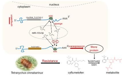 该研究发现长链非编码RNA(lincRNA_Tc13743.2)通过竞争性结合微小RNA(miR-133-5p)促进谷胱甘肽S-转移酶基因TcGSTm02的过表达,从而介导了朱砂叶螨对丁氟螨酯的抗药性。该研究不但揭示了lncRNA在节肢动物抗药性进化中具有功能,而且证实抗药性调控网络中存在“长链非编码RNA-微小RNA-mRNA”的调控通路,阐明了抗药性调控的新机制,为害螨抗药性治理及新型杀螨剂的合理使用提供了理论依据。