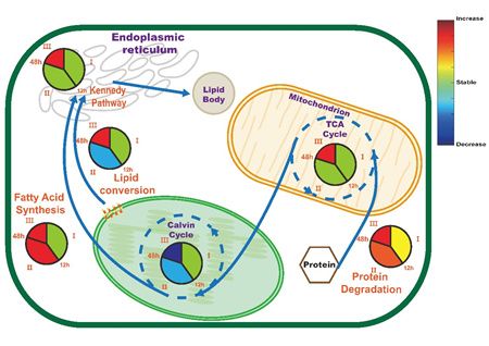针对这一问题,研究人员发表了微拟球藻缺氮胁迫下时间系列的蛋白质组数据,结合相对应的转录组与代谢组数据,应用最新的统计分析方法,较为全面地揭示了细胞在缺氮胁迫下合成甘油三酯的过程特征。研究人员发现,该过程可以分为三个阶段。缺氮初期:此时细胞感受到了外界环境中氮元素的缺乏,但由于细胞内还有一定量的氮储备,其代谢过程的变化不明显。缺氮中期:这一阶段细胞保存的氮已大致消耗完,需要通过蛋白质降解等方式来回收氨基酸中的氮,以维持细胞关键代谢过程的运转,同时光合作用与脂质代谢等过程也受到了不同程度的影响。缺氮后期:细胞进一步提高蛋白质降解的速率,而三羧酸循环与油脂合成的速率大幅上调,光合作用速率虽有所下降但仍在工作。