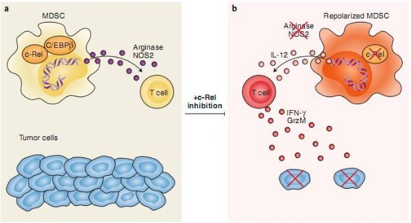 c-Rel是一种特殊的转录因子,其属于结构和功能相关的NF-kB转录因子相关家族,这些转录因子在大多数细胞中能够广泛表达,当被细胞因子、病原体或损伤相关的分子模式受体激活后,这些转录因子就会介导机体快速的转录反应,与NF-kB其它家族成员不同的是,c-Rel主要会在淋巴细胞和髓系细胞中进行表达,尽管c-Rel的缺失此前并未揭示该因子在胚胎发育过程中具有特异性的作用,但研究者发现,其在调节MDSC调节的抗肿瘤免疫反应过程中扮演着非常重要的角色。