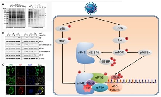 宿主的真核翻译系统也是病毒感染过程中重要的调控靶标,该研究首先通过放射自显影技术证实,新城疫病毒感染后可以选择性抑制宿主蛋白的合成,而宿主的真核翻译系统以及相关的调节通路迅速被新城疫病毒感染所激活,新城疫病毒mRNA是帽子结构依赖翻译。