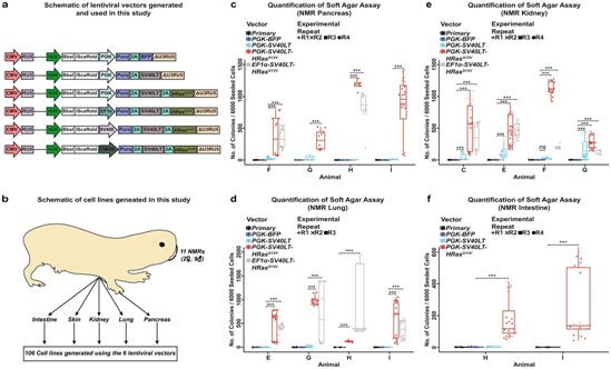 在这项研究中,这些研究人员分析了体外培养的来自11只裸鼹鼠的5种不同组织(肠道、肾脏、胰腺、肺部和皮肤)的79种不同细胞系。他们用经过基因改造后引入致癌基因的病毒感染这些细胞系。这些基因已知会在小鼠和大鼠细胞中致癌,但没想到它们能够将裸鼹鼠细胞转化为癌细胞。