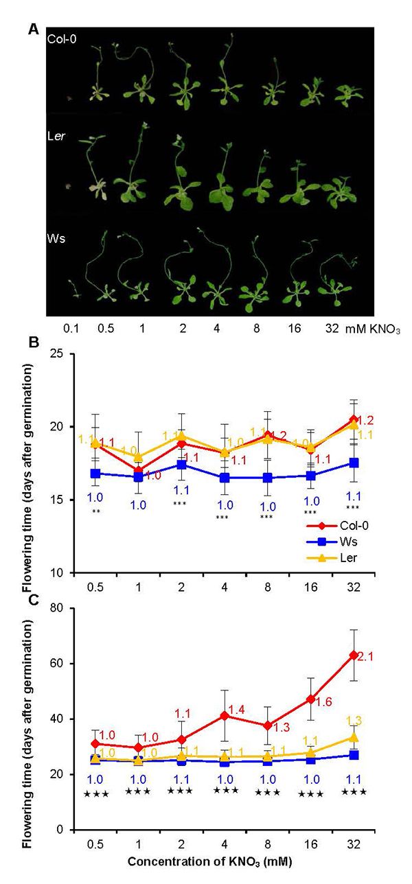近期,中国科学院昆明植物研究所研究员胡金勇团队从拟南芥自然变异响应氮浓度变化协调开花时间角度进行探索。研究探索了拟南芥三种自然变异材料(Col-0、Ws和Ler)开花时间对不同KNO3浓度的响应,分析了拟南芥自然变异开花时间响应氮浓度与光周期的关系。研究发现,三种自然变异的开花时间差异性响应氮浓度变化,且这种响应具光周期依赖性;长日照条件下,Ler和Col-0开花时间对硝酸盐浓度变化的响应相当,Ws最弱;日中性光照条件下,三种自然变异的开花时间均显着晚于长日照条件,但Col-0对氮浓度变化的响应明显比Ler和Ws显着。自然变异的开花时间变化与主根长、侧根数目等生长特征仅有部分关联,且这种关联具基因型和光周期依赖性。不同自然变异响应氮浓度调整开花时间与SOC1和FT表达密切相关;光周期-生物钟途径GI、年龄途径SPL3/4/5和自主-春化途径FLC的表达可能参与调控拟南芥自然变异开花时间对不同氮浓度的响应。该研究丰富了对拟南芥开花基因调控网络的认识,为深入揭示氮营养与开花时间协同调控机制提供了基础数据。